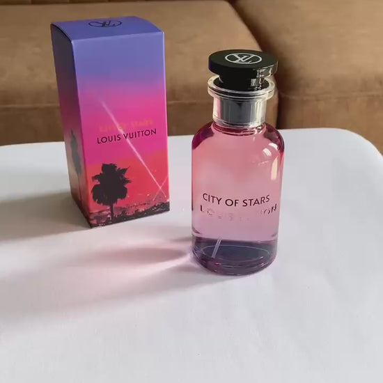 It's a perfume from Louis Vuitton. The bottle has a pink and purple ombré effect, and the packaging features a sunset or dusk scene with palm trees and searchlights, likely evoking the atmosphere of a city like Los Angeles. The name "City of Stars" also suggests a connection to Hollywood or the glamour of a major city.